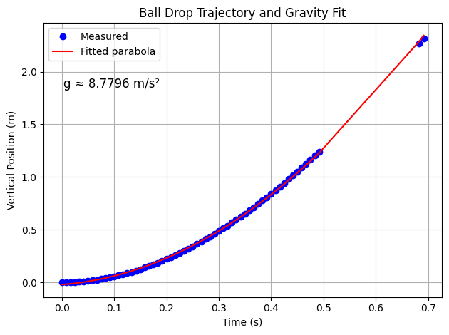 With the use of numpy polyfit we estimate a value of approx. 8.78m/s2.