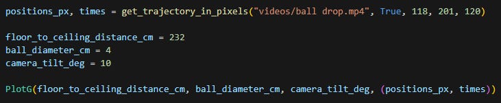 Now that we know the best starting and ending frame we need to get the trajectory in pixels. For that we have ball_drop_trajectory.py. This will give us also the times (times starting on our starting frame, not the beginning of the video).